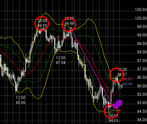 11:20と14:40に95.50で反発。一目均衡表時間足の雲の下限であり、また邦銀・欧州系の買いが入っているからです。96.50~95.50のレンジ内は様子見し、売り方向にブレイクした時に限り売りポジションを追加したいと思います。