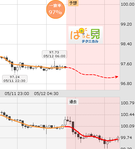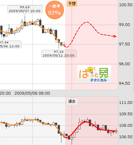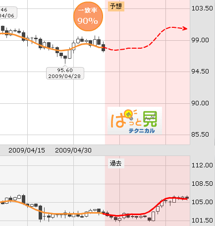 ※FXプライムのぱっと見テクニカルは過去チャートの中から、現在のチャートと形状が似ている時期を瞬時に探し出し「将来の値動き」を予測するものです