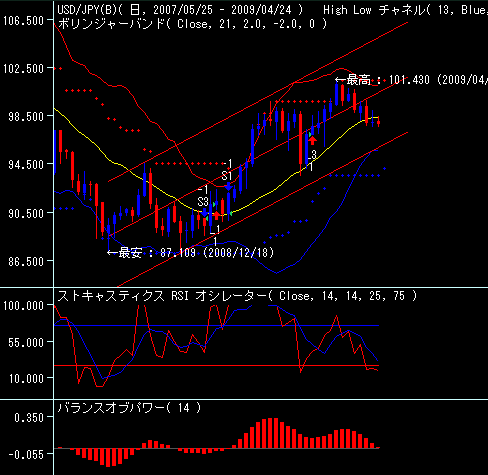 低下傾向ではあるが、4/22の安値97.56円の割り込んではいない。